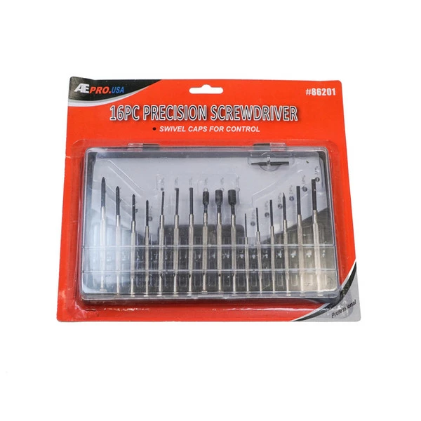 This 16-piece precision screwdriver set is perfect for small crat projects, fixing your glasses, or any other application requiring very small, precise screwdrivers. The shafts are hardened, and the black oxide finish will help these tools resist rusting. The caps swivel, allowing you more control over the tools, which have been ground horizontally, providing greater torque! Comes with a handy plastic case, marked with the size for the screwdriver that fits in the corresponding slot. This is a must-have for any toolbox!