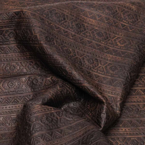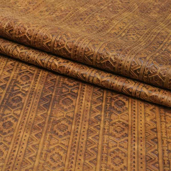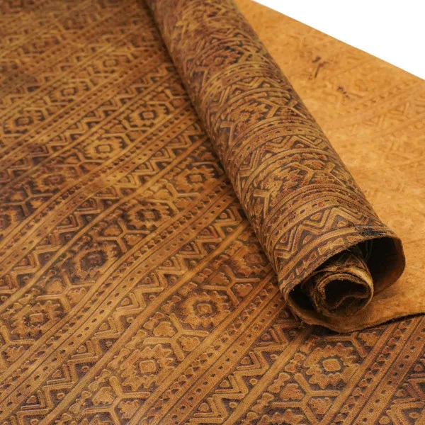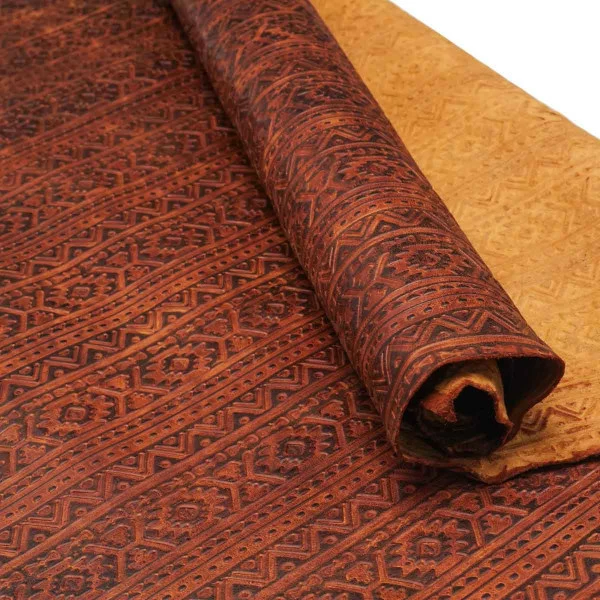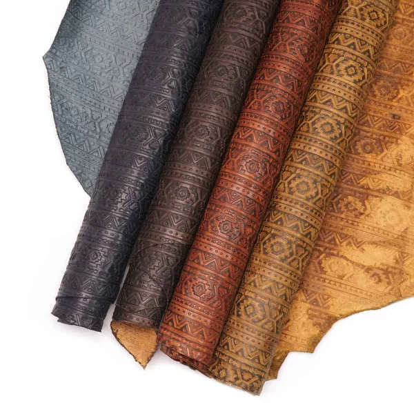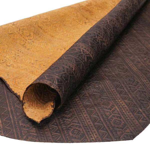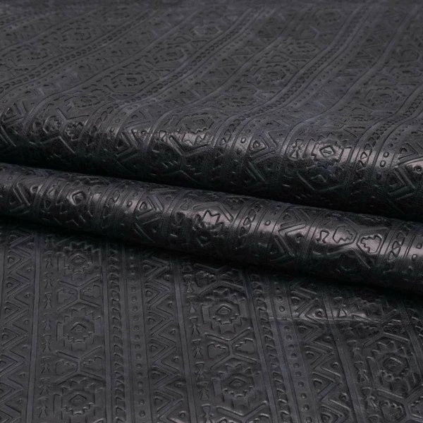 Authentic Lightning embossed leather showcases shapes and designs influenced by tribal symbols. This top grain leather is fully aniline dyed, finished with waxes and oils, and hand-tipped with contrasting color for a rich, two-toned look. Available in four rich colors. This leather is perfect for handbags and clutches, laminated wallets, minimalist wallets, and other personal leather goods. It’s also suitable for upholstery and home décor applications, as well as footwear!