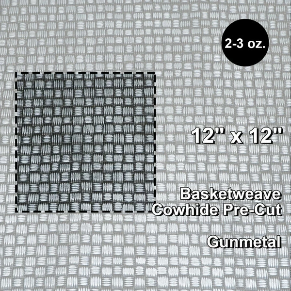 Basketweave Cowhide Pre-Cut – Gunmetal – 12″ x 12″. Sides of Cowhide leather with a Basketweave design in a Gunmetal color, Leather is 2 – 3 oz. (.8 – 1.2 mm.).