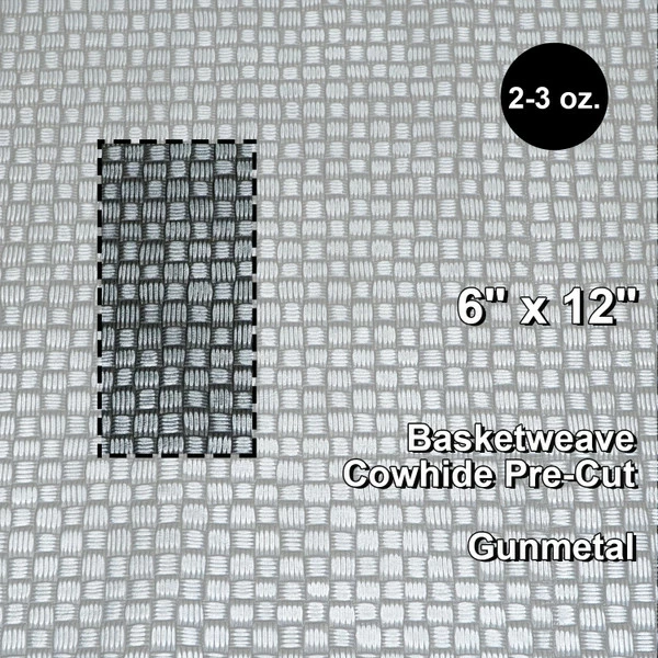 Basketweave Cowhide Pre-Cut – Gunmetal – 6″ x 12″. Sides of Cowhide leather with a Basketweave design in a Gunmetal color, Leather is 2 – 3 oz. (.8 – 1.2 mm.).