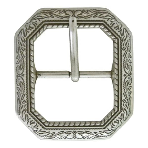 Cody Clipped Corner Buckle. Great looking buckle! Nicely engraved and excellent for gun belts, western wear, etc… Polished silver plate. 1-1/2″ only. Item #378-787505.