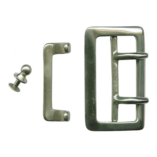 A truly unique piece of hardware with a rectangular adjustable buckle that is backed by two hooks and a tab. This 3 piece set is most commonly used for light duty utility belts. Item #4-052002.