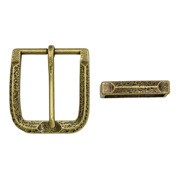 This 2-piece, Antique Brass Windsor Buckle Set fits 1-1/2″ (3.75 cm) belts, and has a finish that features some distinctive, contrasting small impressions in the metal. A great, simple and classy touch to your belts or purses!Â