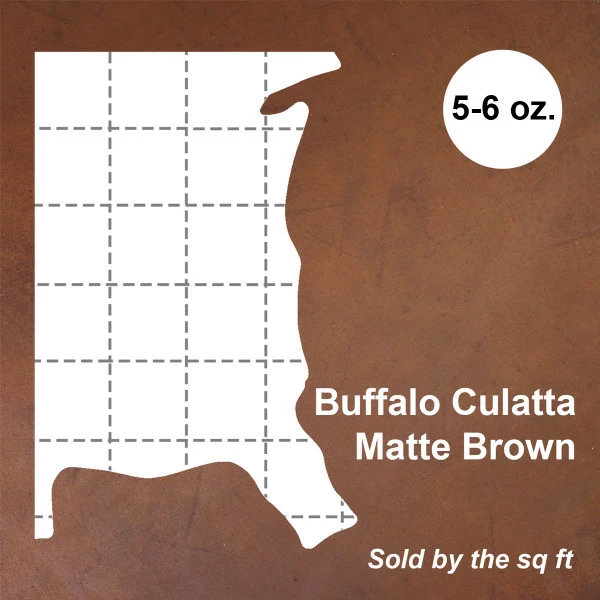 Very nice, good quality water buffalo with a matte finish! 5-6 oz. Average size: 8-11 sq. ft. Would make glorious belts, cases, saddle bags, etc. Order what ya want, we’ll cut it for you!