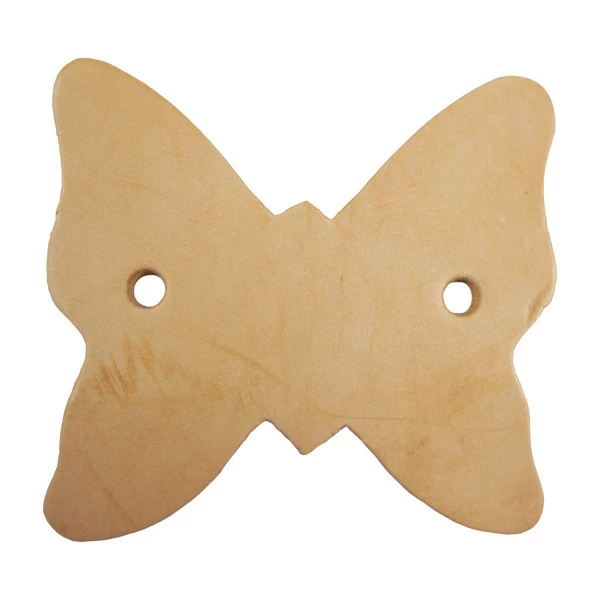 Camp & Craft Shape – Butterfly Barrette. Approximate measurements – 3-1/2″ x 3-1/2″ (8.9 x 8.9 cm). Cut from 7-8 oz. (2.8 – 3.2 mm) natural veg tan leather. Available as each, 25 pack, and 100 pack.