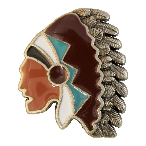 Jazz up your projects with this Antique Silver Chief Head concho that features colorful enameled inlays. Attaches with two screws. Approx. 1-1/8″ x 1-3/8″. Â