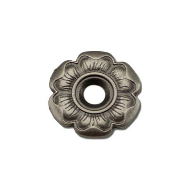 Designed to fit our synthetic rivets and more. Now available in 4 finishes-Original Antique Silver, Antique Nickel, Antique Brass and Antique Copper. All are 3/4″ in diameter except for the Rope Edge which is 9/16″. Antique Nickel Flower is item #115-778604.