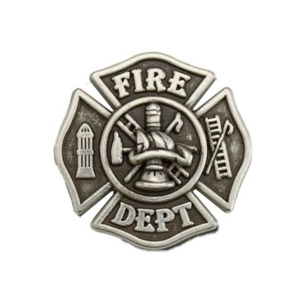 1 1/4″ Antique Silver Plate Screwback Concho in the shape of the Fire Department logo. Item #141-010.