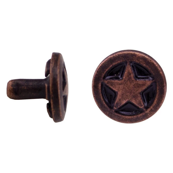 Small star concho with black background. Now available in 5 finish options. Silver, Gold, Antique Silver, Antique Gold and Antique Copper. Rivetback. 3/8″ diameter. For Antique Copper order item #378-775705.