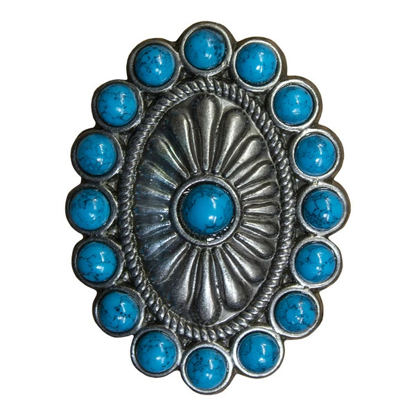 This southwest designed oval concho has an antique nickel finish, and is studded with synthetic turquoise stones for a truly authentic southwestern look! Screw back with two screws. 1-3/4″ x 1-1/4″. Item 378-8002.