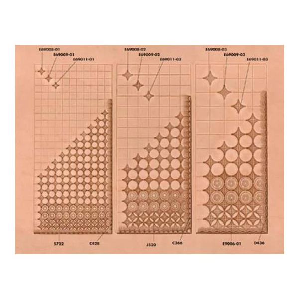 This grid Craftaid is designed to help yu properly align the three sizes of stamp sets numbering: #111-6900800, #111-690900, and #111-6901100. Craftaid reusable templates are the easiest way to transfer tooling patterns to leather projects. The raised design imprints the pattern into damp leather. Included is a photo carve diagram showing the tools and techniques used for best results.Â