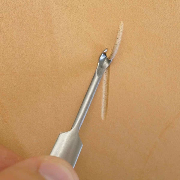 This is a durable, stainless steel, U Groover Tool is ideal for making clean, precise, and smooth fold lines as well as gouging out stitch lines. Especially great for heavier leather that doesn’t like to play nice and cooperate. This tool is essential if you’re making handbags and cases that require right angles and sharp folds. Denny, our mastercraftsman, says, “It works well, but the handle is a bit short and it makes pretty wide grooves.”