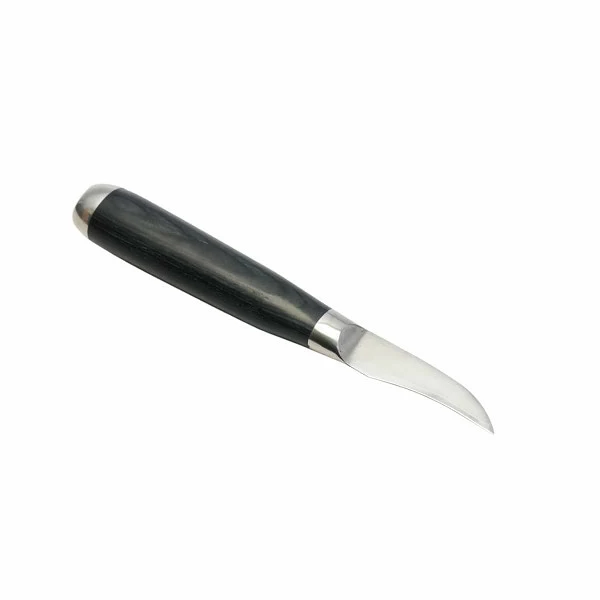 Both Damascus Trim Knives feature a Pakka-Wood handle. The grain is clearly visible on the handle of the curved blade, but the handle on the straight blade has a slightly darker color, which makes the grain a little less visible.