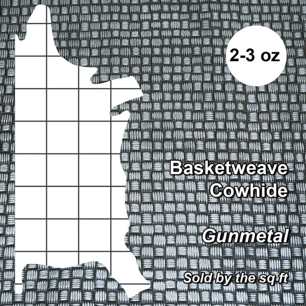 Embossed Basketweave Side – Gunmetal. Sides of Cowhide leather with a Basketweave design in a Gunmetal color, Leather is 2 – 3 oz. (.8 – 1.2 mm.). Average side is 20 – 23 square feet. Sold by the square foot, We will cut.