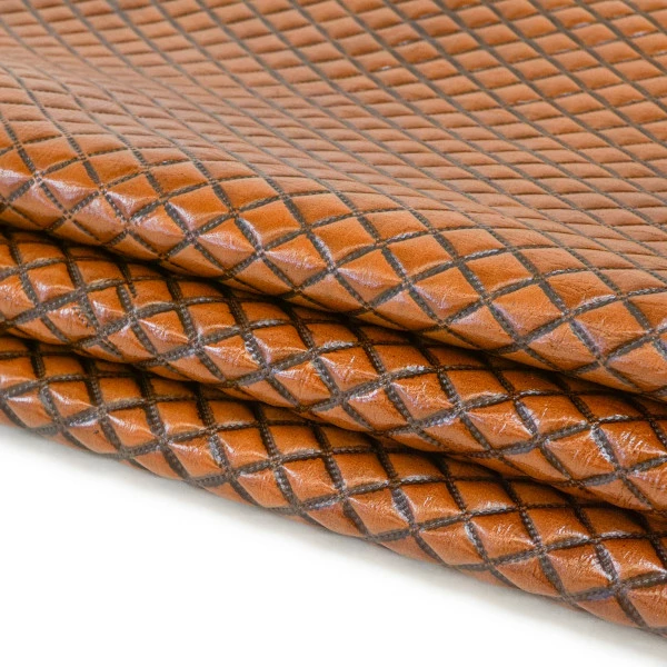This golden brown embossed leather is perfect for anyone looking to add consistent quilted texture to their project. With a raised diamond pattern, this soft leather is lightweight and pliable, and easily maintains its shape. The finish gives it a subdued shine, while the more deeply embossed parts are defined by chocolate brown staining and stitch-like grooves. This fine quality leather is ideal for handbags, car interiors, furniture and other large projects.