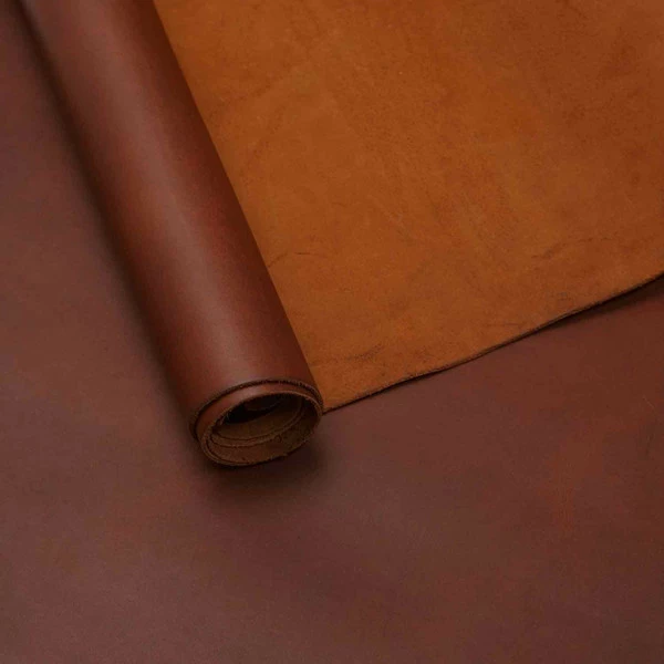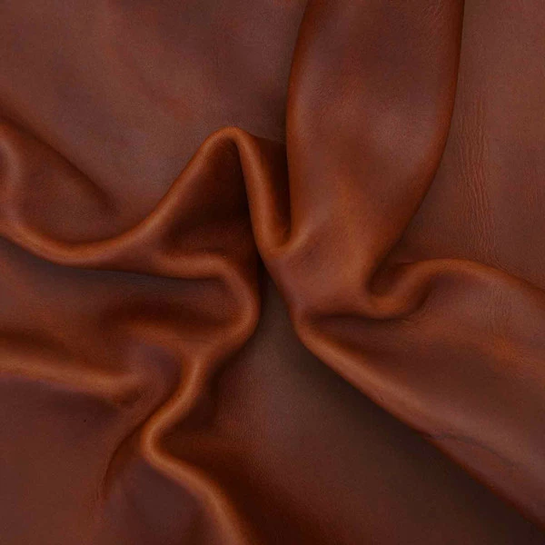 English Chestnut leather is a rich, garnet red with a slight pull-up and smooth grain. The leather displays some stretch and a moderately soft hand. It would be glorious for a wide range of items, producing an exquisite final product.