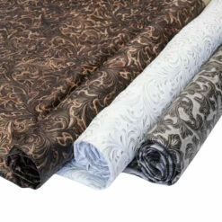 This decorative, embossed print embodies the romanticism of a French countryside. With wispy vines and hand-tipped, two-tone finishing, this leather would be perfect for bags of all sorts, including totes and duffles! Perfect for upholstery applications such as seat covers, cabinet inlays, and more! With three colors to choose from, the possibilities are endless! Colors include Soft Pearl #665-404, Gold Rush #665-405, and Stone #665-406.