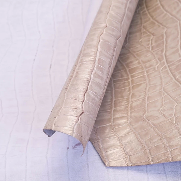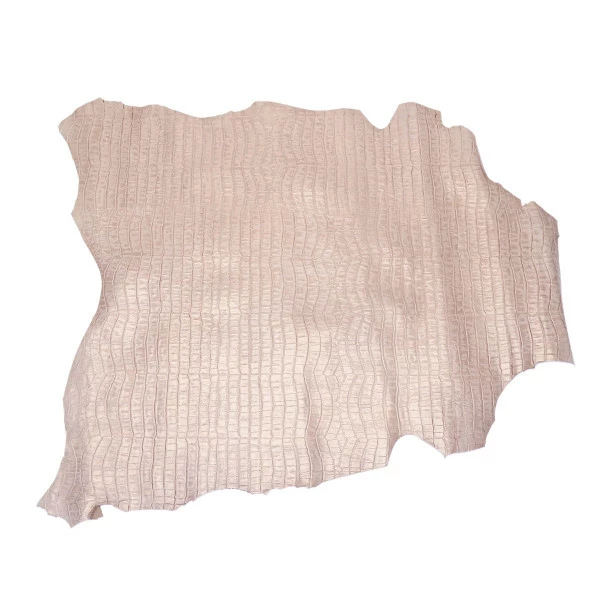 These are high-end kidskins that have been embossed with a gator tail style print. The two-toned taupe color is neutral enough to match a whole lot of different colors, making this leather ideal for wallet and clutch interiors and pockets, trim, watchbands, and other personal leather goods!