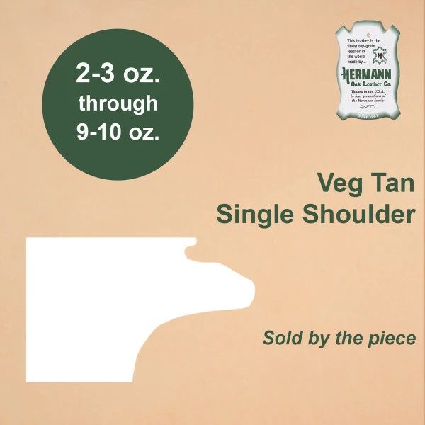 Hermann Oak Single Shoulder. These range from 5 – 6 square feet and are available in 2 – 3 oz. (.8 – 1.2 mm.), 3 – 4 oz. (1.2 – 1.6 mm.), 4 – 5 oz (1.6 – 2 mm.), 5 – 6 oz. (2 – 2.4 mm.), 6 – 7 oz. (2.4 – 2.8 mm.), 7 – 8 oz. (2.8 – 3.2 mm.), 8 – 9 oz. (3.2 – 3.6 mm.), 9 – 10 oz. (3.6 – 4 mm.), and 10 – 11 oz. (4 – 4.4 mm.). These are sold by the piece, we will not cut them.