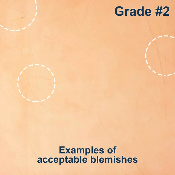 Grade #2 is just a step below grade one. Just like our premium grade, brands, knife marks and excessive bug bites are not acceptable. A small hole is acceptable, as long as the placement is easily worked around. The difference between the two grades lies in the placement of blemishes and the quantity. A small scar smack dab in the middle of the pre-cut is fine, as long as it is relatively easy to work around. A few in inconvenient places are acceptable, but if the piece is covered in blemishes, it is not considered a grade 2 piece.