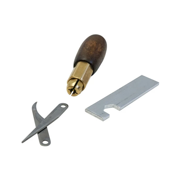 Custom turned 2″ walnut handle, solid brass jaws and ferrule for years of durable use. Includes #9 blade (5/16″ x 2-1/4″ deep curve) and #11 blade (5/16″ x 2-1/4″ straight grind on slanted edge). Item #131-359500.