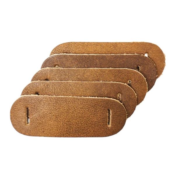 Approximate measurements – 1-1/4″ x 4″ (3.2 x 10.2 cm). Cut from assorted earth tone oil tan leather. Available as each, 25 pack, and 100 pack.