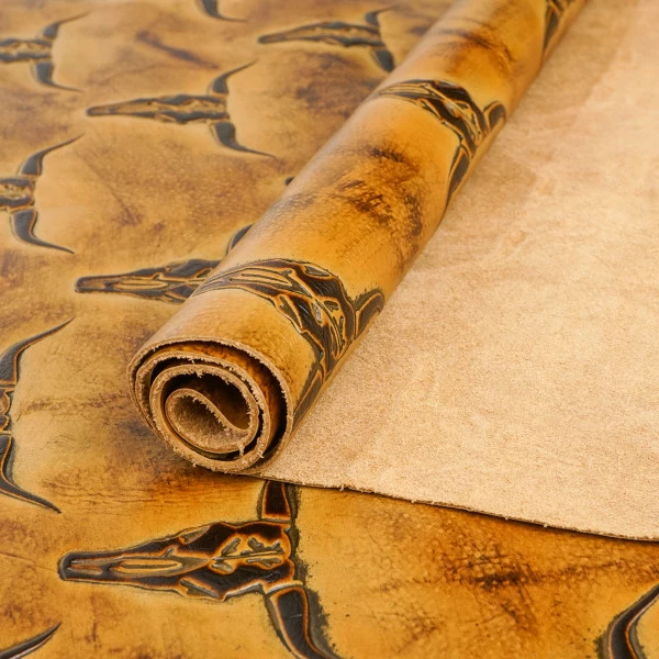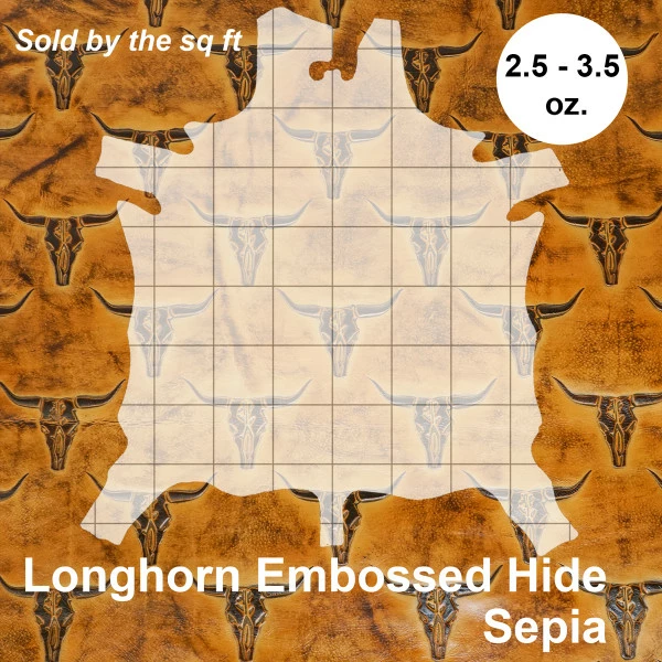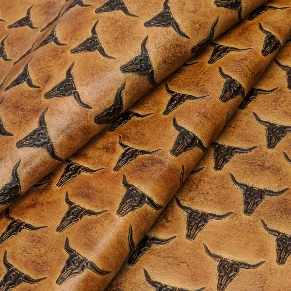 This striking Texas Longhorn skull design will add a bold look to any leather project! With two pattern sizes in three colors, we think these leathers will bring a unique flare to your next bag, journal cover or other lightweight projects! Great for making bags, totes, clutches, wallets, cases and satchels, and other personal leather goods! This would also make for great upholstery applications, such as, seat covers, ottoman covers, table and cabinet inlays, and so on!