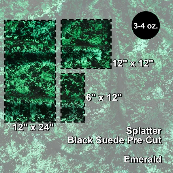 Splatter Suede in Emerald, Pre-Cuts. 3 – 4 oz. (1.2 – 1.6 mm.). Available in 6″x12″, 12″x12″ and 12″x24″. Cut from 62-2014.