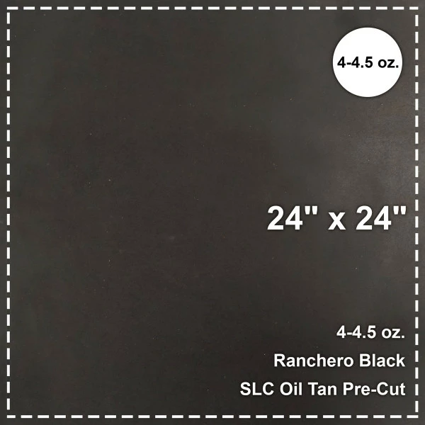 Ranchero Black, 4-4.5 oz. leather is a gorgeous, midnight black leather with a smooth grain and glossy finish. The leather has a medium hand and some stretch. This leather would make excellent wallets, bags, and more.