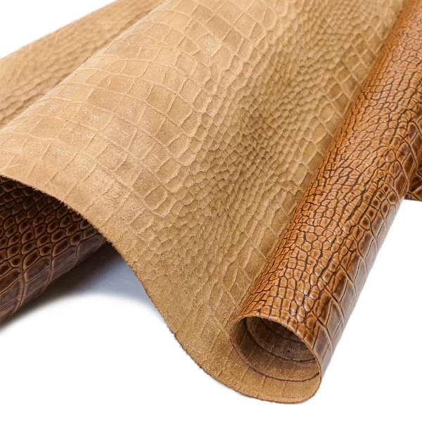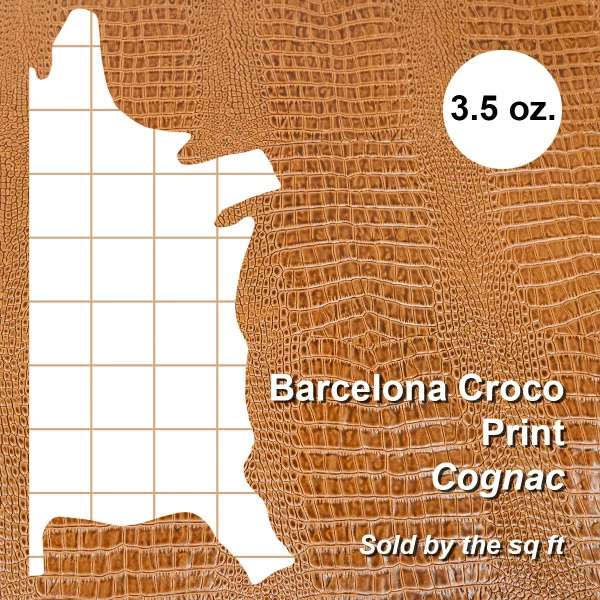 Cognac,Barcelona Croco Print These gorgeous sides are embossed with the classic small croco print and have been beautifully finished, lending to a rich two-toned look. These sides sport a semi-firm hand, which makes them perfect for bags and laminated belts. Tanned in Italy. Sides average 18-22 square feet and are about 3-1/2 oz. Sold by the square foot. Item #57-1264. PLEASE NOTE: If your particular color choice is not in stock at time of order, we may have to special order it. In that case, please allow up to 2 weeks for delivery.