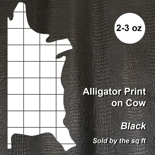 Beautiful Alligator print embossed onto split cowhide with a semi firm hand. Very classy. This leather is perfect for interiors and exteriors alike. Great for Notebook Covers, Handbags, Wallets and accessories, as well as beautiful linings! This is very nice leather that will make any project look rich. Average 10-14 sf. and approximately 2 to 3 oz. Sold by the square foot. Item # 371-17901.