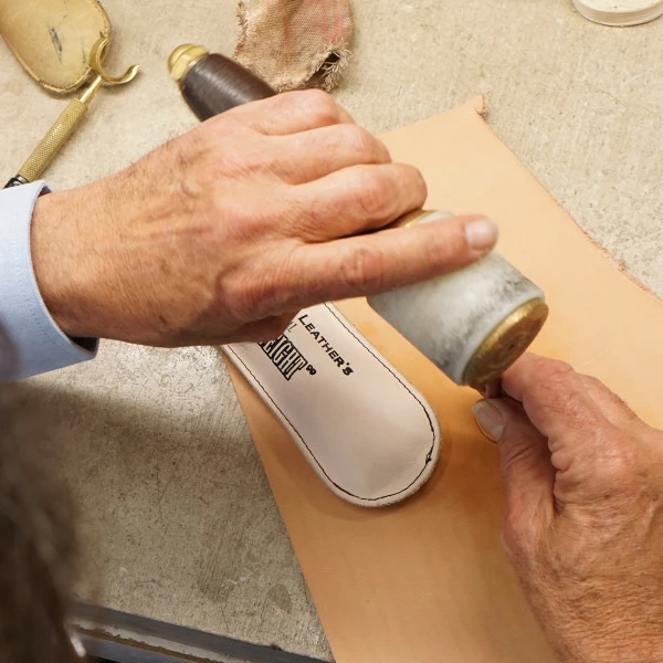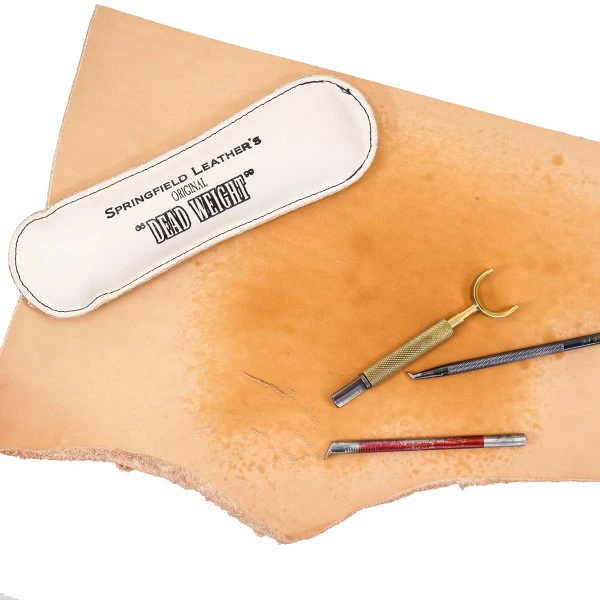Make tooling easier without sacrificing style with an SLC deadweight.This is approx. 2lb, made of veg tan, and measures 8″ long, 2-1/2″ wide.
