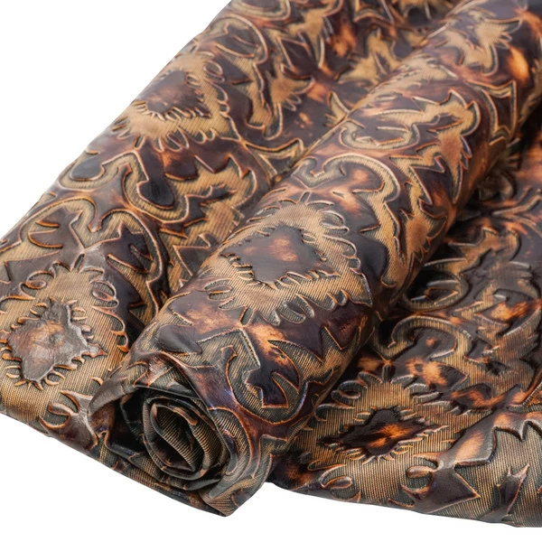 If you’re looking for a taste of the old west and want a bold and fiery pattern with a splash of modernistic style, then our Western Laurel is right up your alley! The two-tone finish really brings out the deeply embossed pattern, enhancing the highlighted areas giving this leather a little extra pop! Great for large upholstery and bag projects, like seat covers and totes! This leather comes in whole hides, which we’ll cut into sides, but order what you want because we’ll cut it for you.